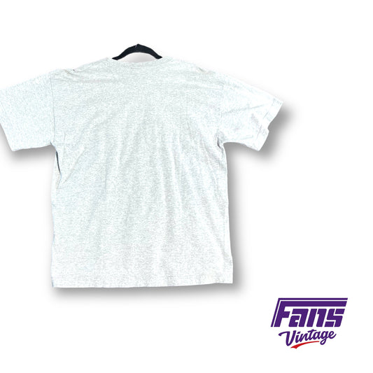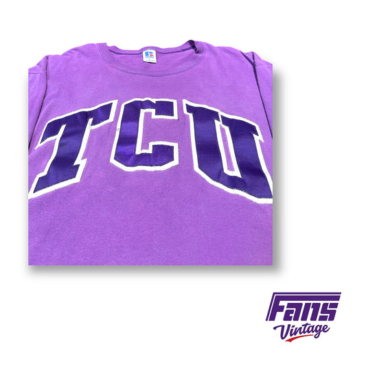 Vintage TCU “Thrashed” Tee with awesome lavender color & satin jersey stitched lettering