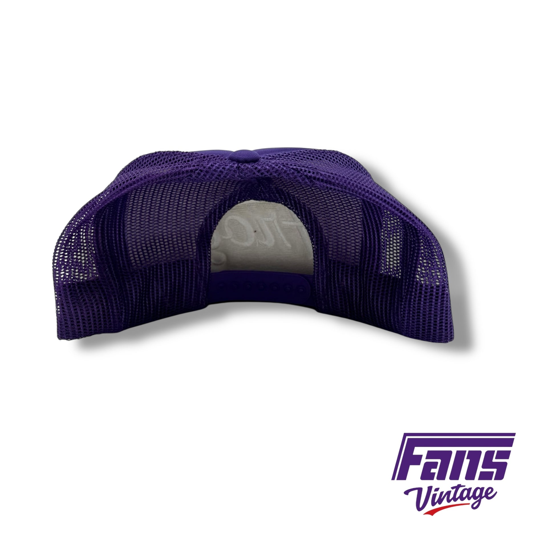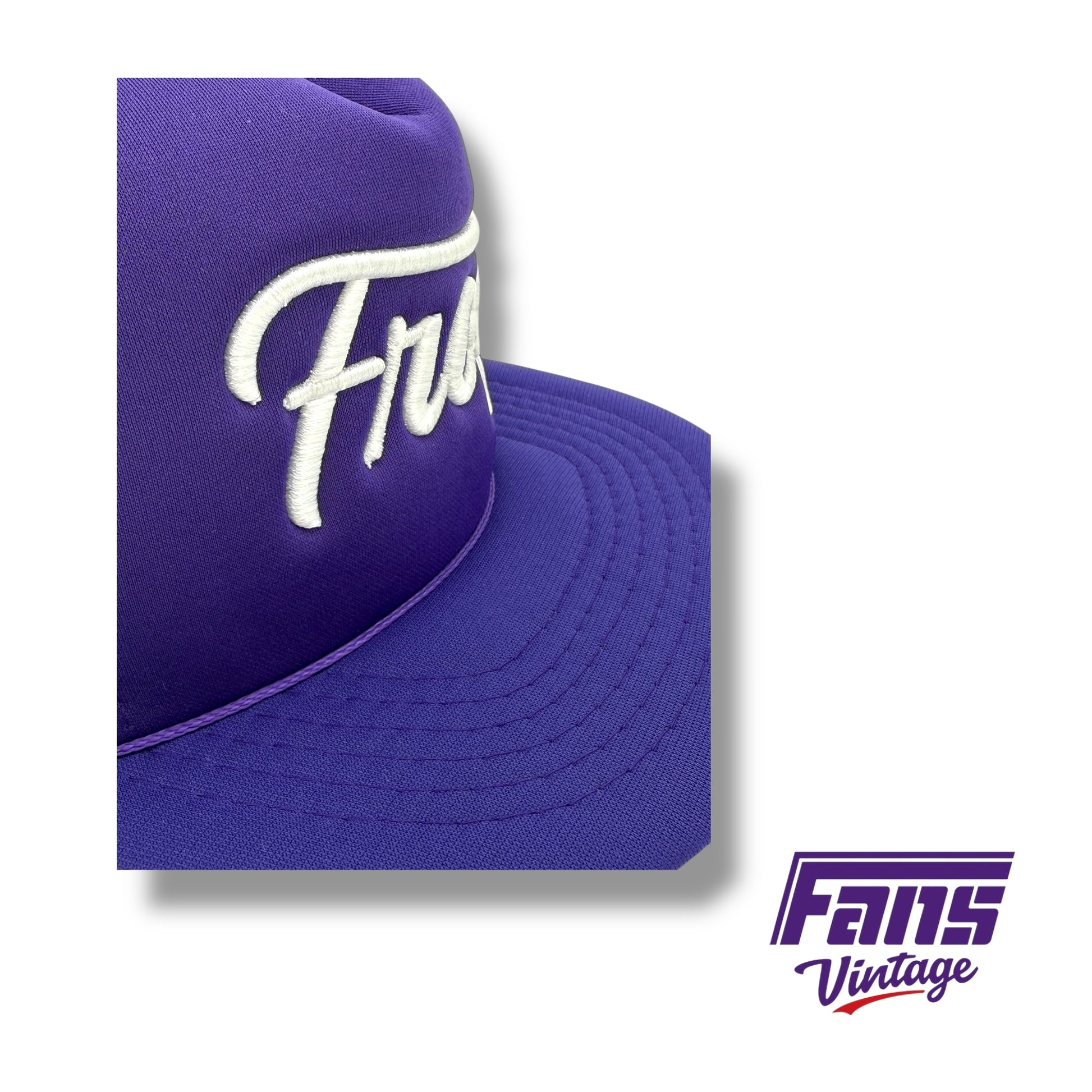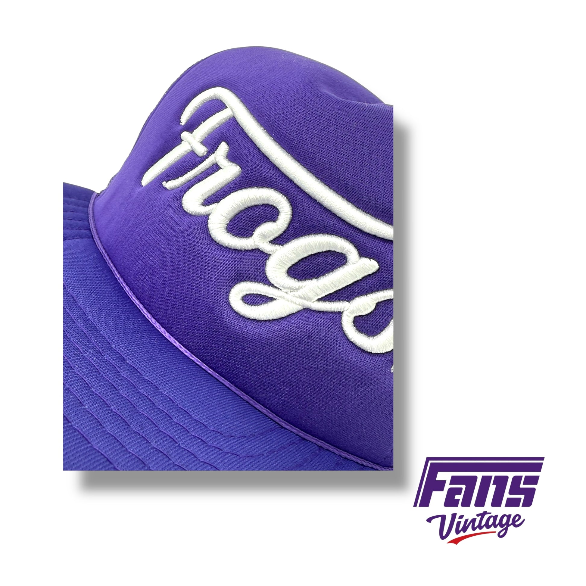 Gorgeous raised “puff” embroidery with our TCU licensed EXCLUSIVE modified “Frogs” script vintage logo - it has an extended top on the letter F as an homage to the Flying T logo!