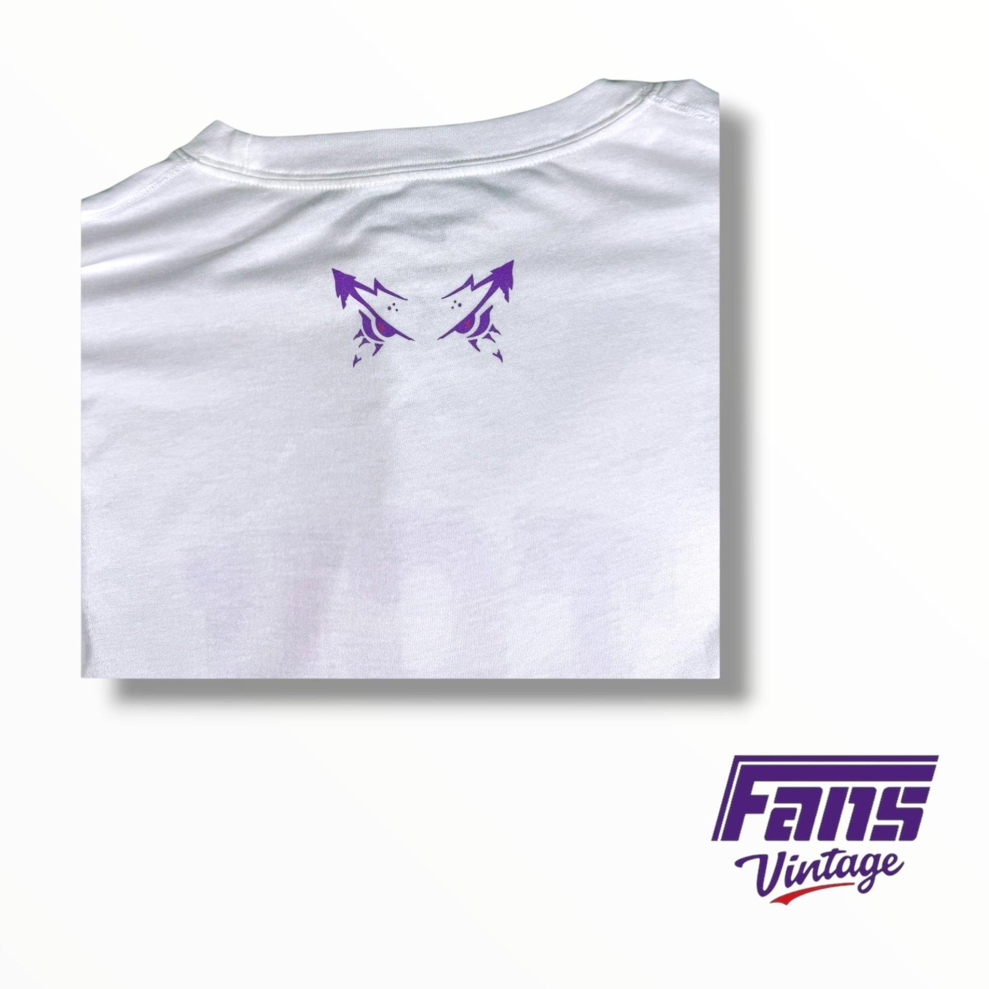 White Nike soft dri fit shirt with large front print TCU logo and side big XII logo and back frog eyes logo