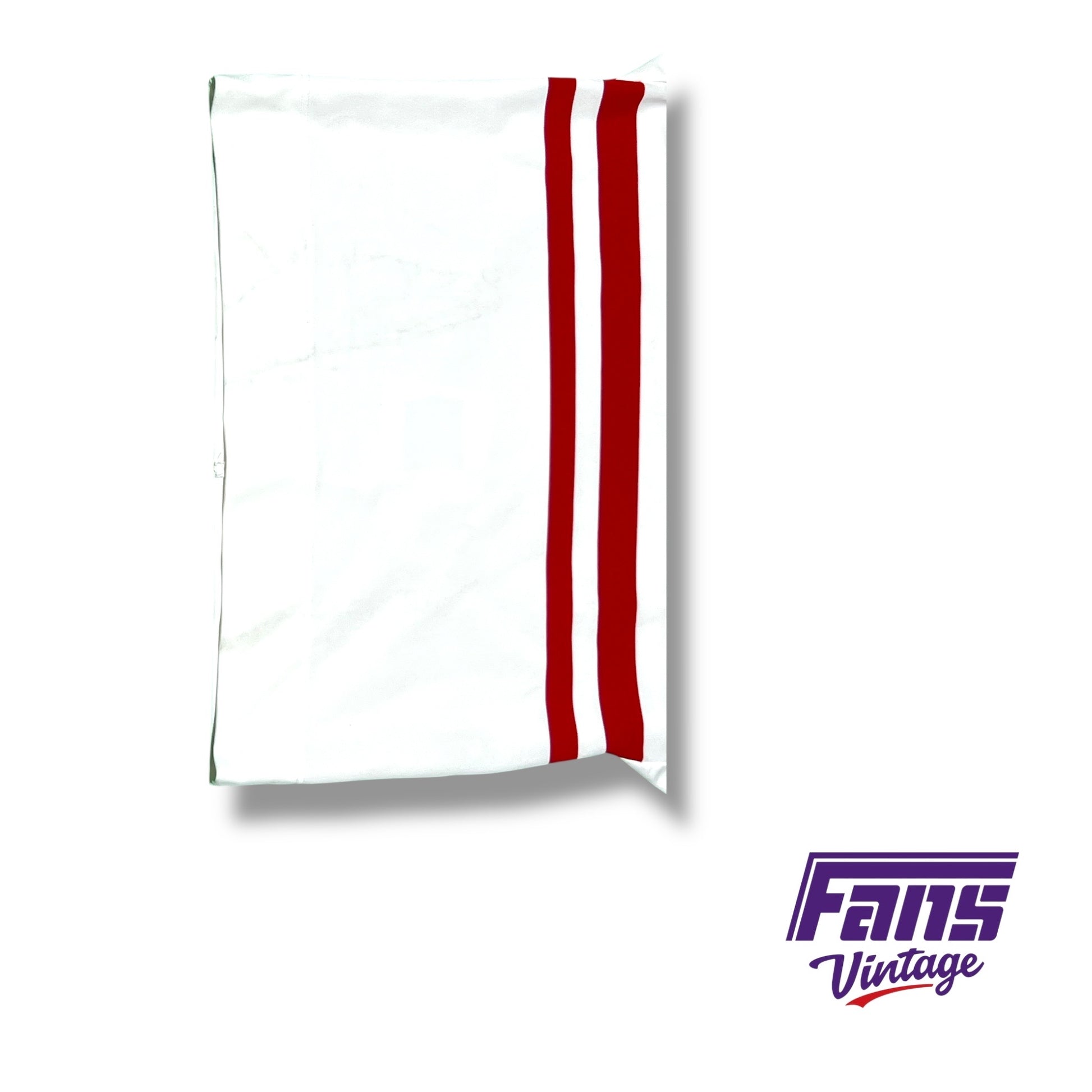 Classic Detroit Red Wings jersey from the 1991–1992 season featuring the NHL 75th Anniversary patch. Red and white striped pattern with patched “DETROIT” lettering across the front from the Gordie Howe era.