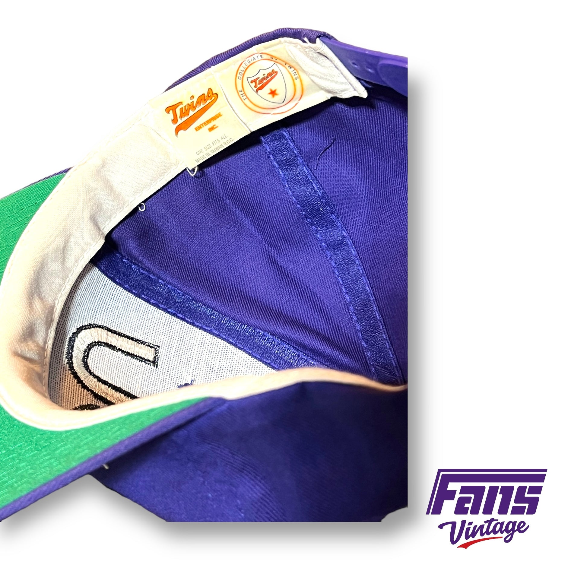 Unique outlined sans serif font rarely seen on TCU vintage hats and modern hats! Super clean look with purple exterior and green under bill. Minor signs of age, fantastic vintage condition.