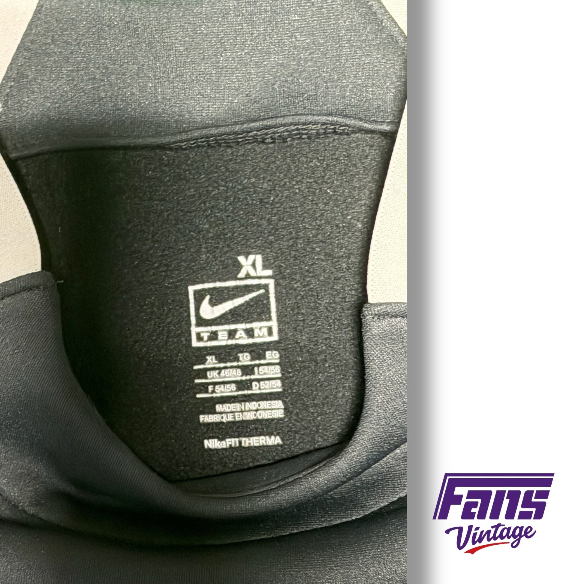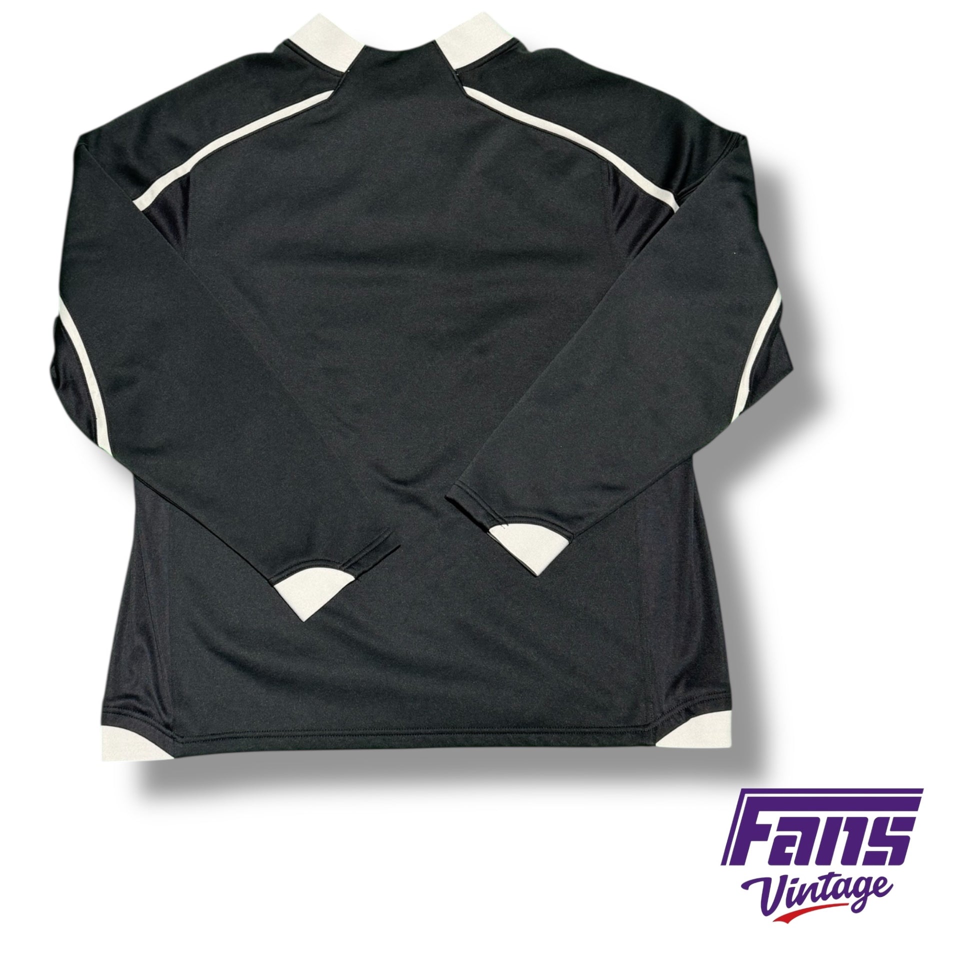 Team issued black Nike Therma fit pullover with grey details on the collar grey details mirroring on both sleeves as well as the back. Grey Nike swoosh embroidered in the center upper chest followed by TCU logo in purple with grey outline embroidered underneath.