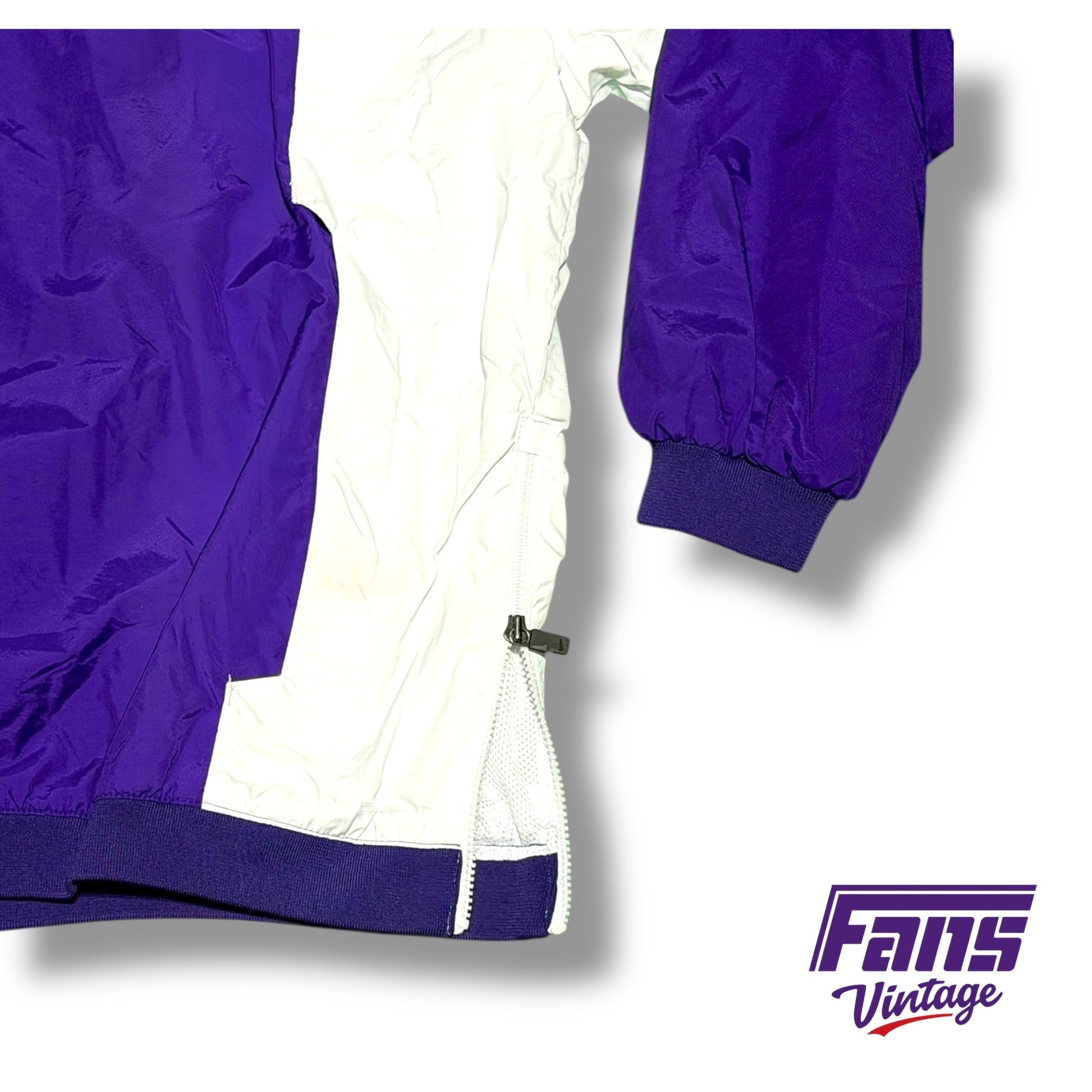 Team issued purple Nike windbreaker pullover with white details on the neck and white details mirroring both sides and underneath the sleeves. White TCU logo with black outline embroidered in the center top followed by a white Nike swoosh embroidered underneath. Zip up kangaroo pocket in the front.